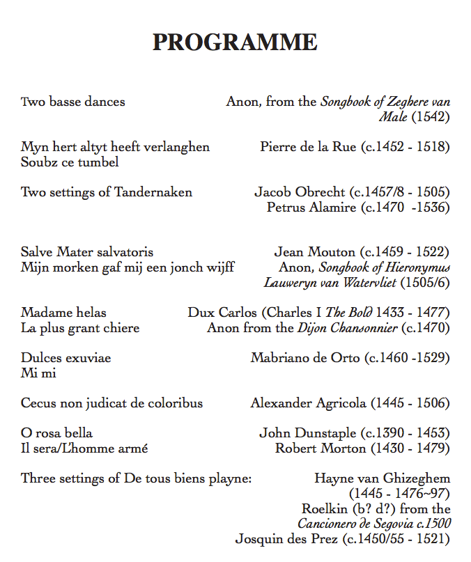 The language of the court was French, Flemish being considered largely the language of the vulgar people and of commerce. Throughout the 15th century the dominant secular vocal form was the Burgundian chanson, in which some of the finest French verse is set, predominantly for three voices. Instrumental performance of this repertoire is testified to by the huge number of chansons in un-texted copies in collections, both published and private, that made their way across Europe. Ottaviano Petrucci’s 1501 publication, Odhecaton, was not only the first printed book of music, but also a conduit for largely Burgundian chansons entirely without text. It was hugely popular and widely disseminated in the Italian peninsular.
